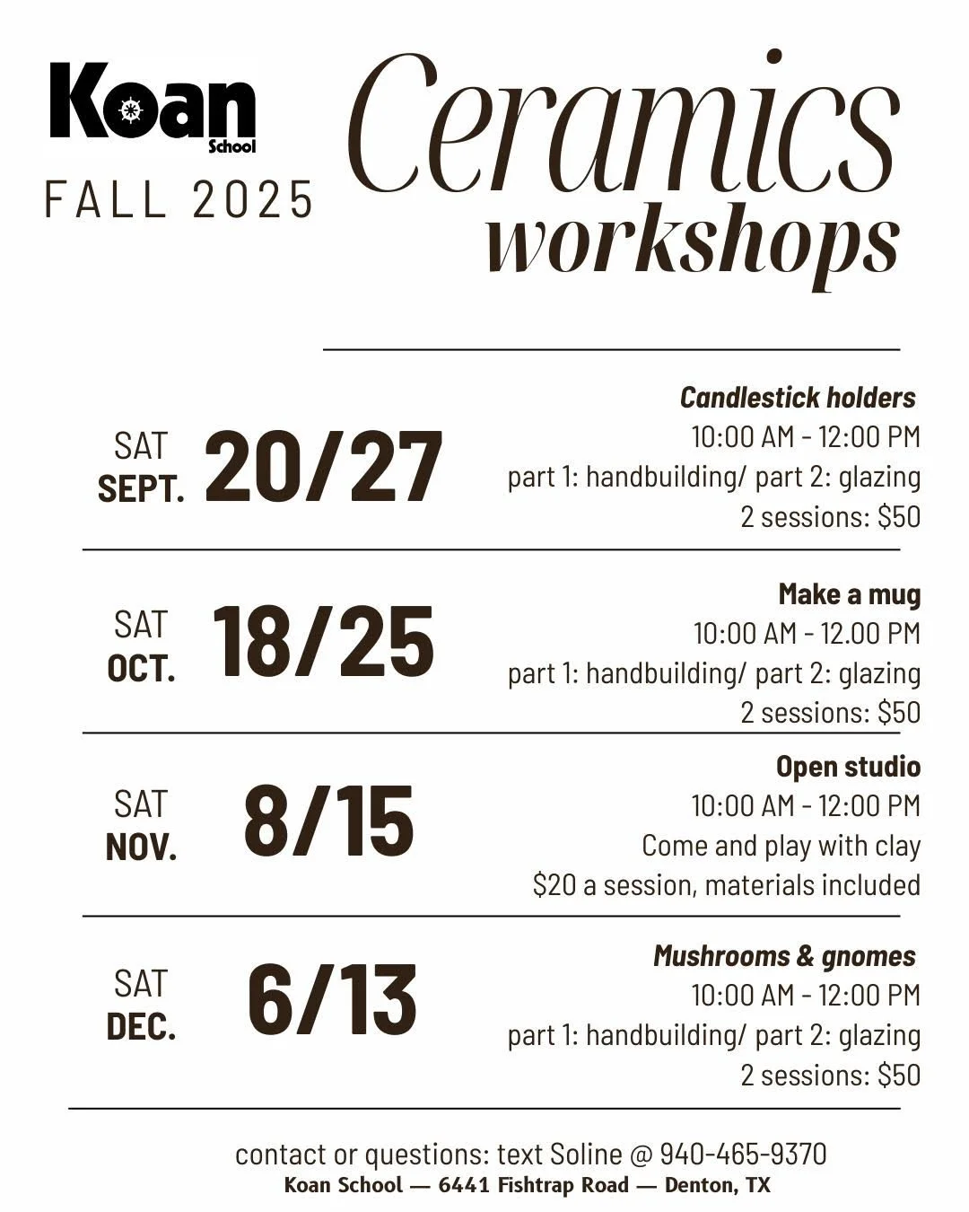 Through the years, the staff at the Koan School has enjoyed sharing their unique creative talents with each other. From basket weaving in Amanda’s backyard to collaborating on fundraising efforts and campus beautification projects, we have valued learning from each other. It is through this desire to share our skills and our recently renovated art building with the larger Denton community of crafters that the Koan Arts Workshop was born.
